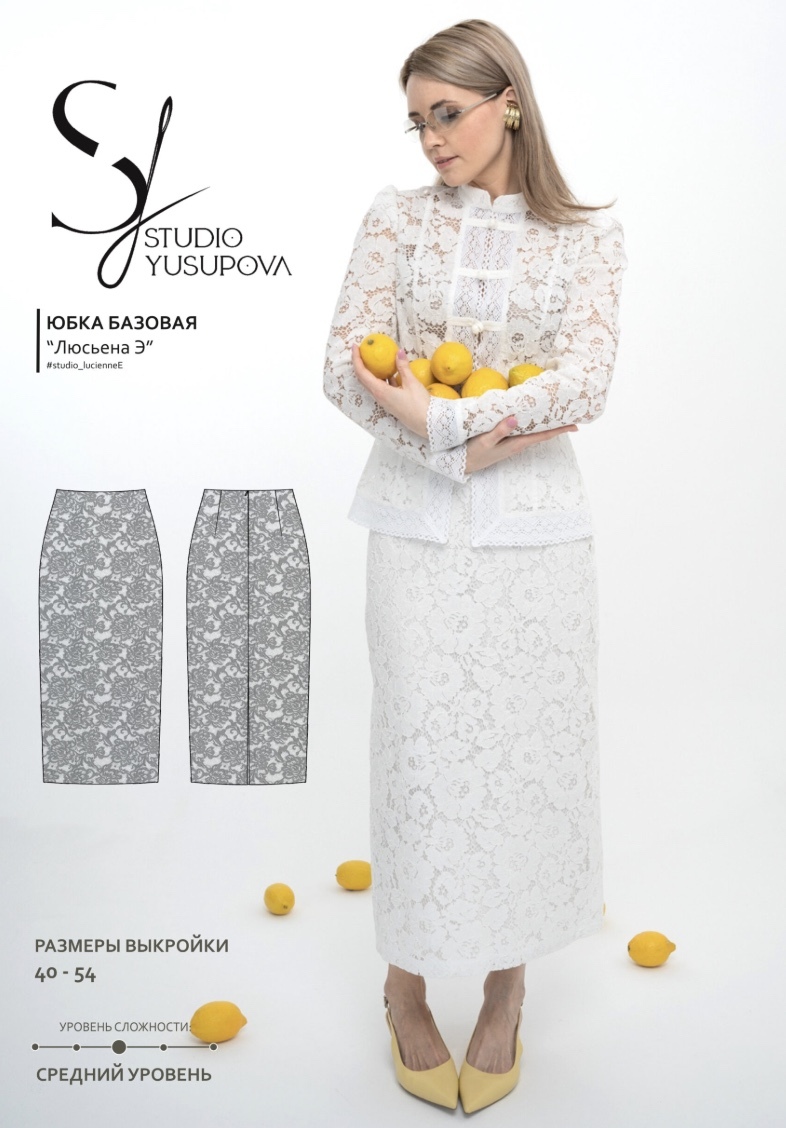 Выкройка классической прямой юбки умеренного объема, без пояса, с верхним срезом, обработанным обтачкой. Заднее полотнище снабжено талиевыми вытачками и средним швом с потайной застежкой-молнией, завершающимся в нижней части высоким разрезом для свободы движения. Модель выполнена на подкладке. Длина изделия — ниже середины икры.