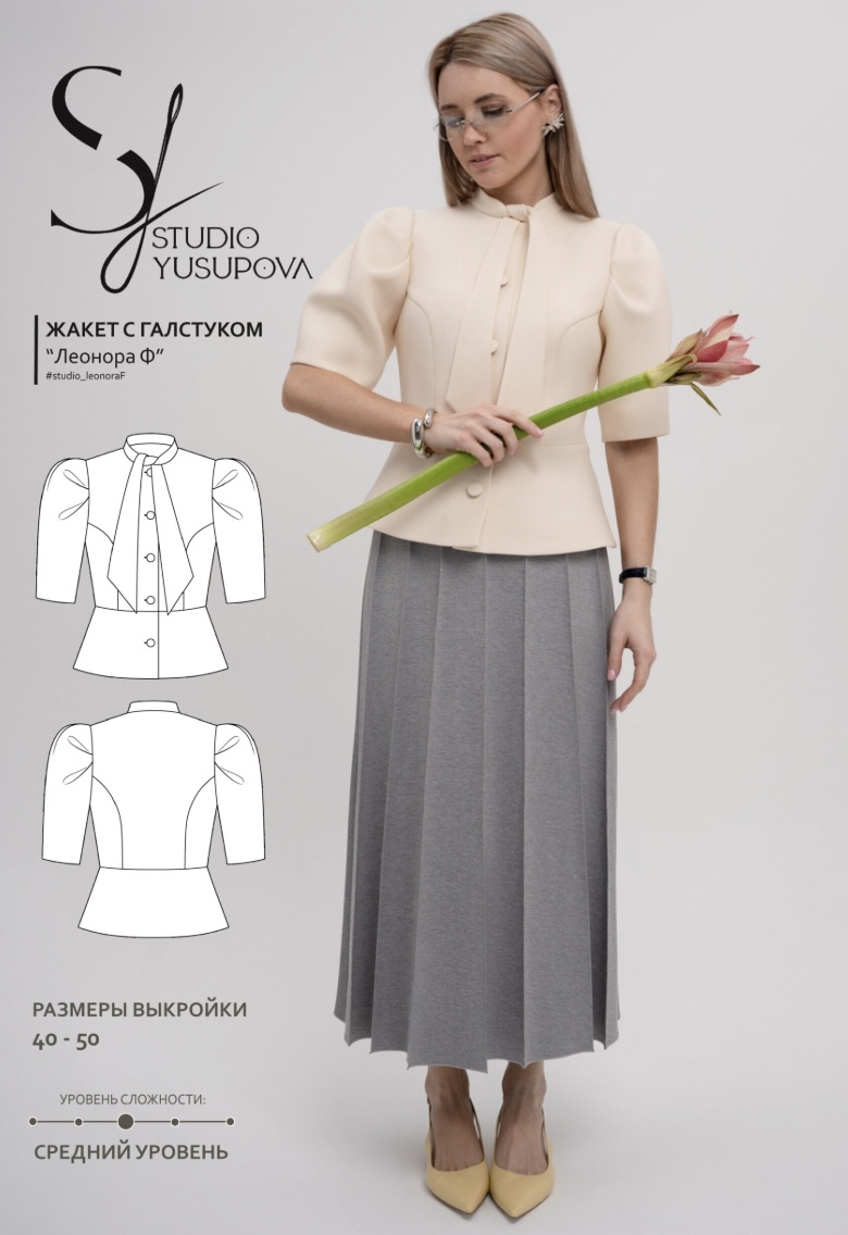 На полочке и спинке предусмотрены рельефы. Рукав укороченный, по верхней части оформлен крупными складками. Горловина обработана притачным воротником с удлиненными концами, выполненными в форме банта-галстука. Застежка центральная, на обметанные петли и пуговицы. Изделие выполнено на подкладке. Длина жакета — выше линии бедер.