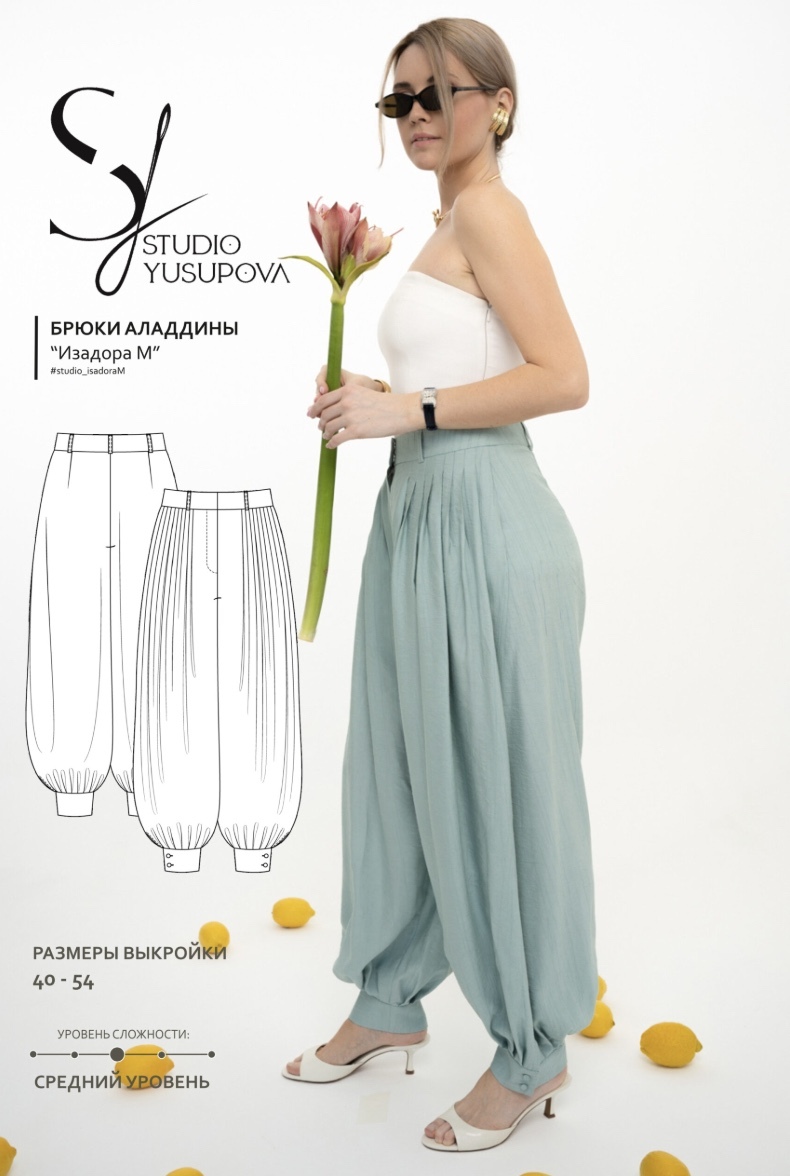 Выкройка брюк большого объема. На передних половинках складки направлены в сторону боковых швов. На задних половинках талиевые вытачки. В верхней части боковых швов оформлены карманы. По нижней части боковых швов выполнены разрезы. По низу передней и задней частей брюк расположены складки. Нижний край брюк обработан