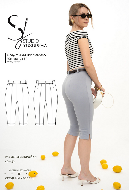 Выкройка брюк малого объема, прилегающего силуэта, длиной ниже колена. На передних и задних половинках брюк предусмотрены фигурные (рельефные) швы и вытачки. Пояс притачной, расположен по естественной линии талии, дополнен настрочными шлевками. Застежка на потайную молнию обработана в левом боковом шве. По низу брюк в боковых швах выполнены разрезы.